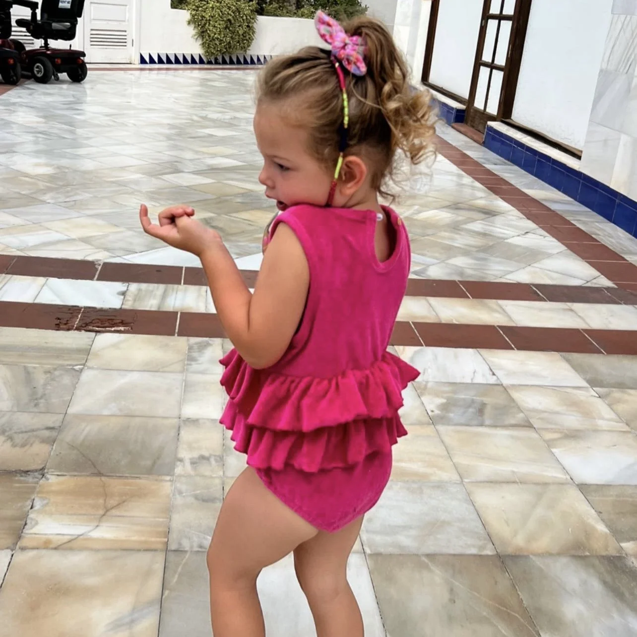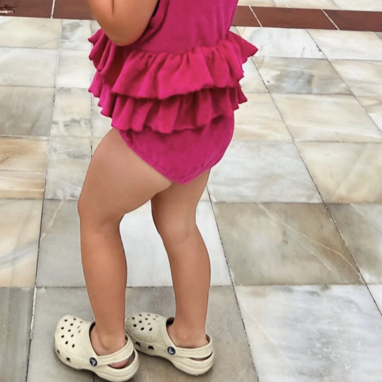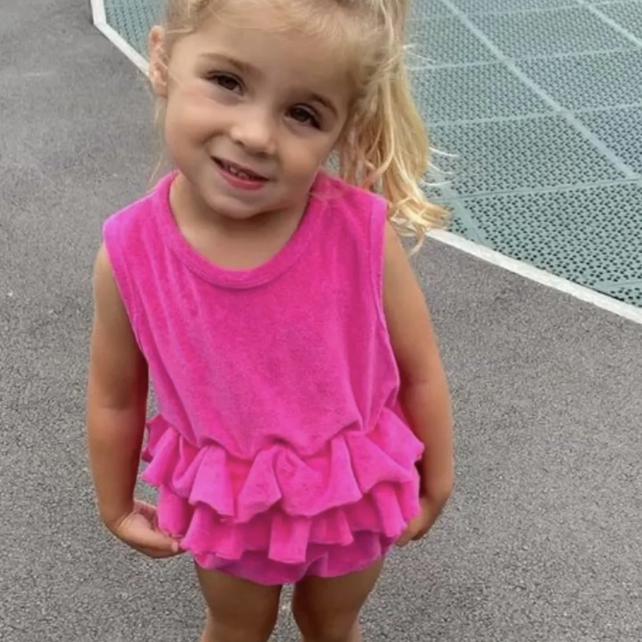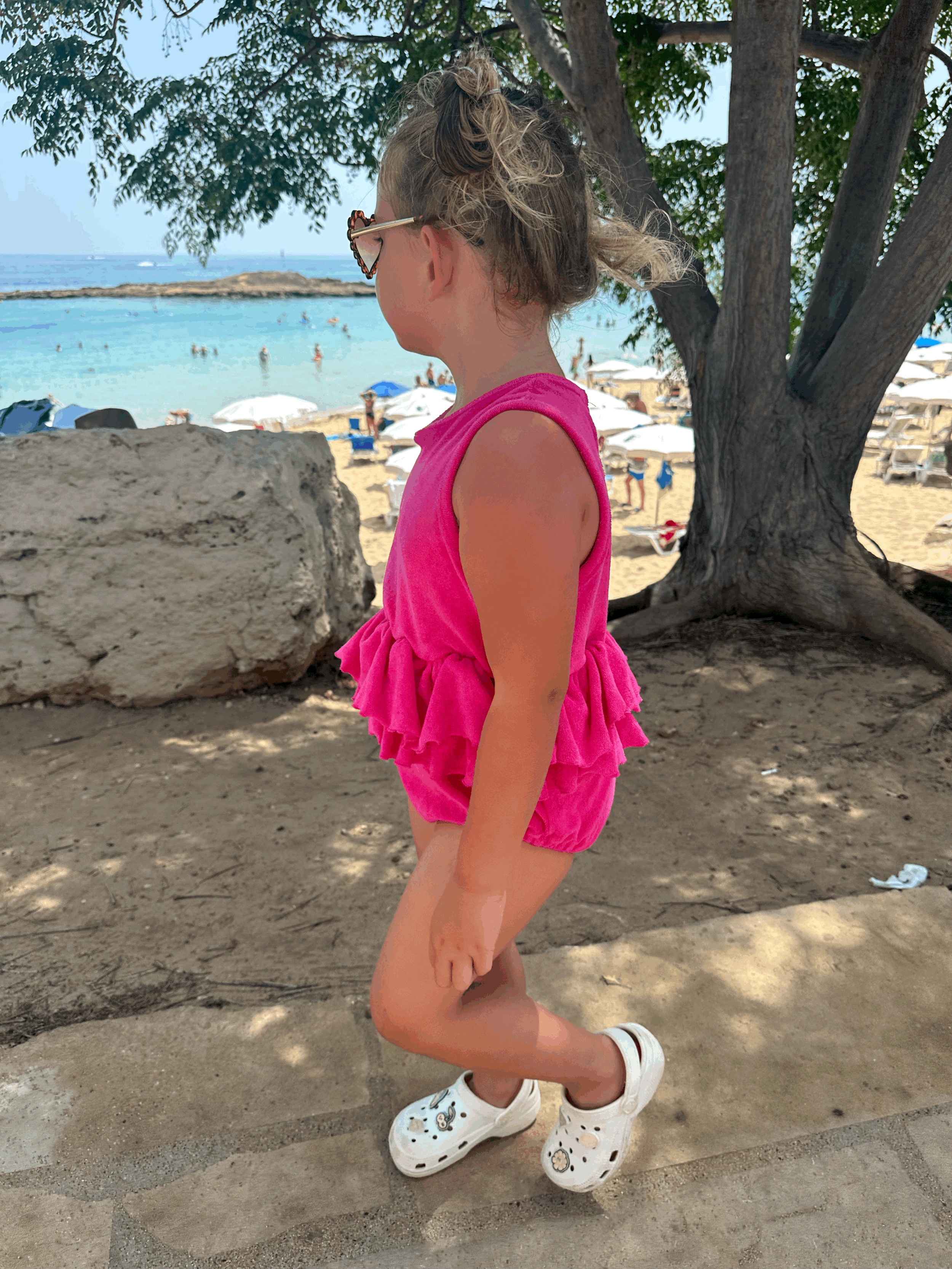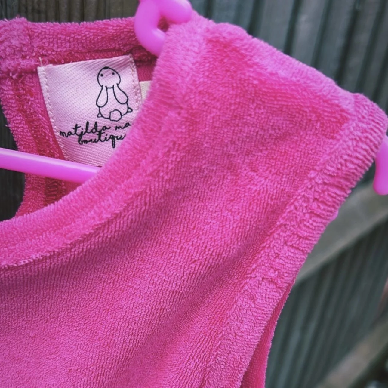 Our Beautiful hot pink towelling romper.. made from soft towelling material with an elasticated frill waist. Perfect for hanging out around the pool or on the beach, we just love this look!