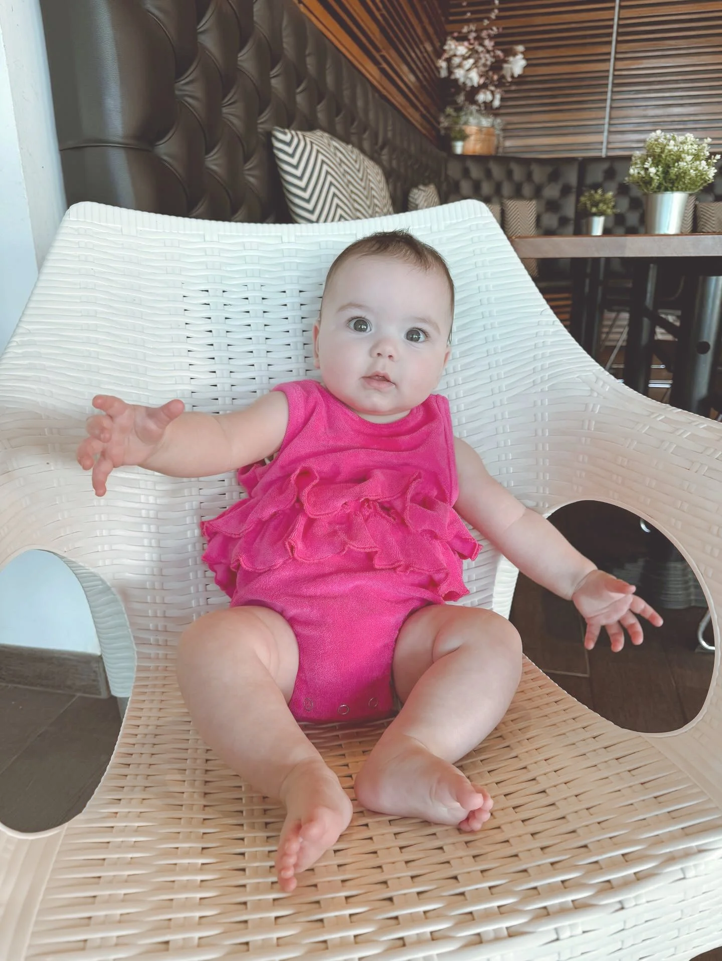 You’ll climb into the romper as if you would a swim costume, as mentioned above the frill waist is elasticated with lots of movement. Sizes 3m-2yr have poppers to make baby changing easier. We get it!